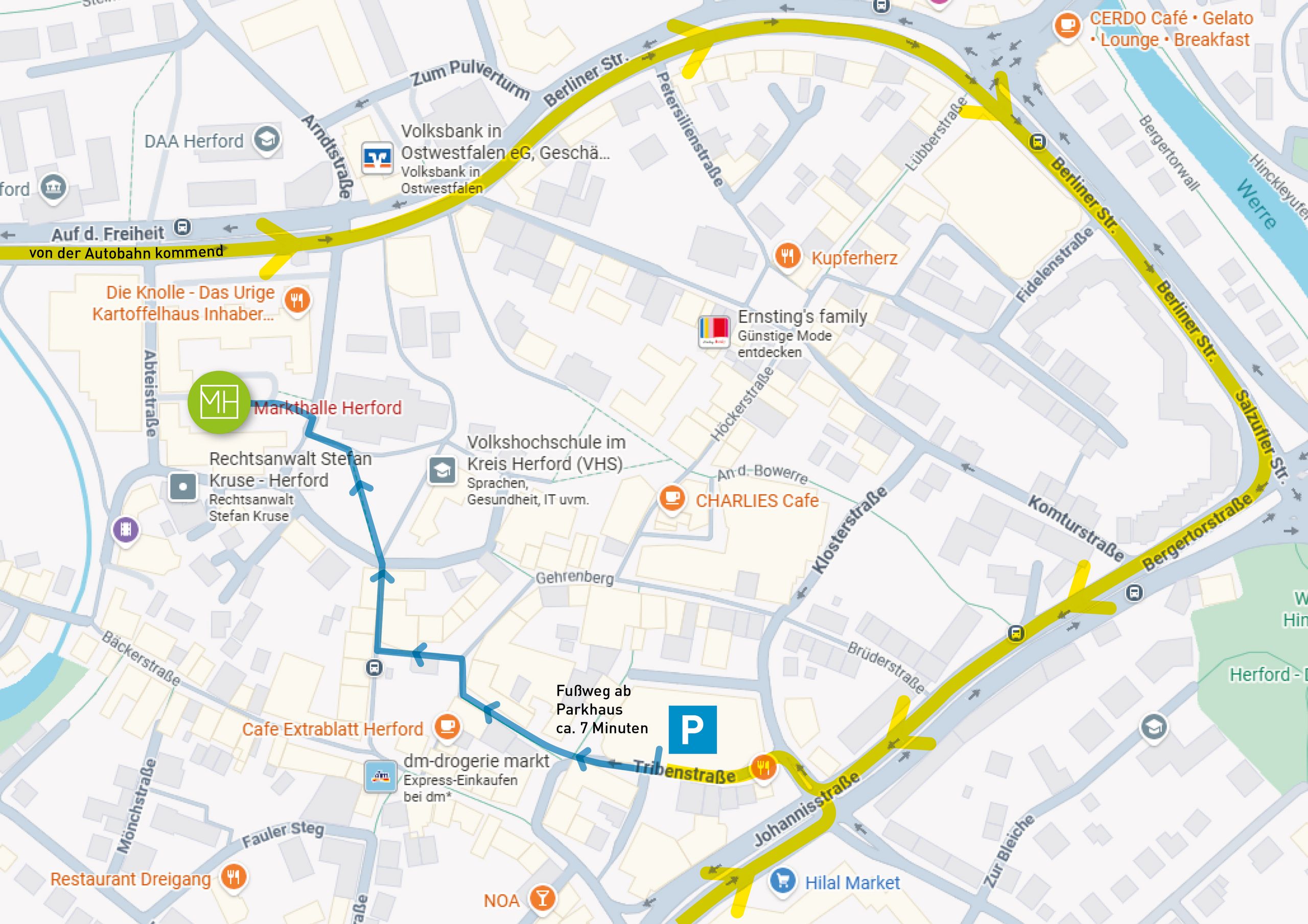 Links finden Sie eine Wegbeschreibung vom Parkhaus zur Markthalle, die Sie sich per Rechtsklick herunterladen können.